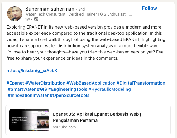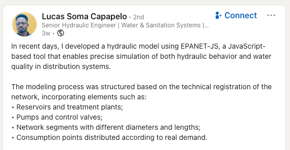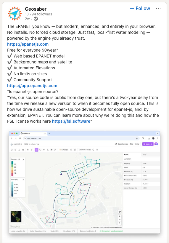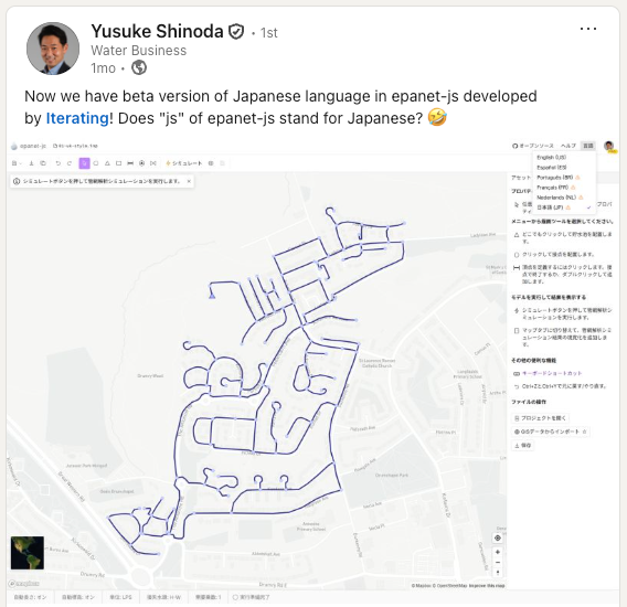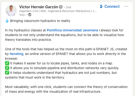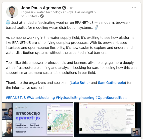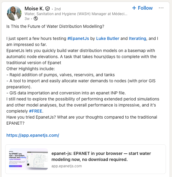 We're deeply grateful for everyone who takes the time to talk about epanet-js publicly. It helps us reach new users and keep the conversation growing. If you do share something, remember to tag Iterating, Sam, or Luke, and we'll make sure to amplify it.